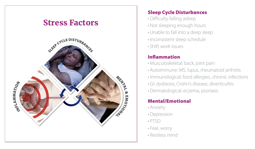 Stress combined with an overactive HPA axis has been implicated in contributing to a wide variety of mental health problems, and can further perpetuate pain and inflammation if left unchecked. Stress causes the adrenals to produce elevated levels of cortisol resulting in a sequence of changes in the brain that affect mood and memory. When stress levels are high, fight-or-flight chemicals epinephrine (adrenaline) and norepinephrine are also released, resulting in a heightened sense of alertness. This state of hyper-vigilance leads to anxiety and restlessness.