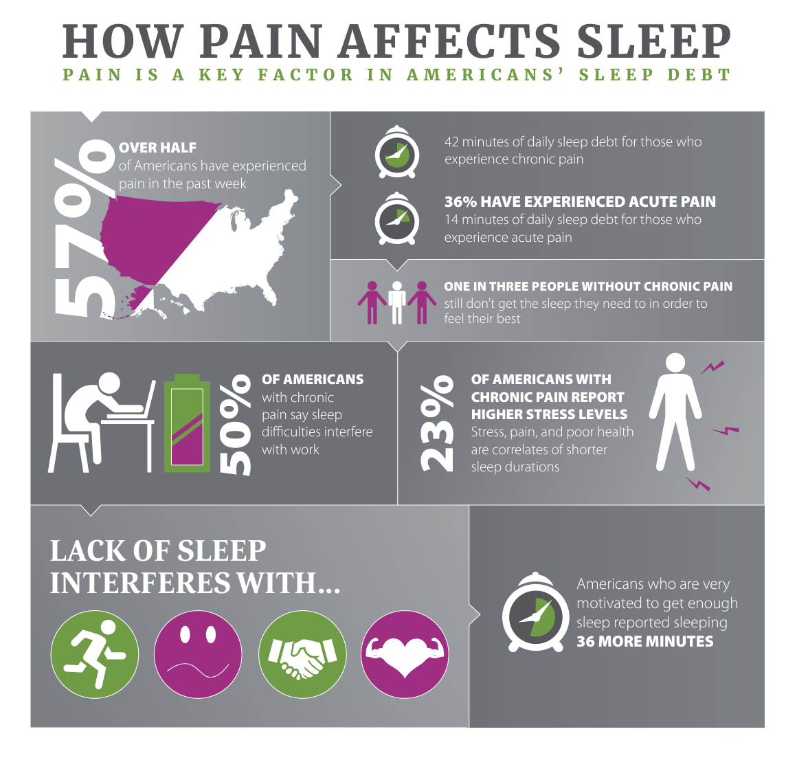 Adequate sleep is necessary for long-term health and regeneration. Many of the body’s repair processes occur during the deep, slow-wave stages of sleep. Skin and other connective tissues regenerate themselves during the sleep cycle. Research shows that those with less sleep had a predictably higher pain level than those with eight hours of sleep. Lack of sleep can cause or exacerbate pain.