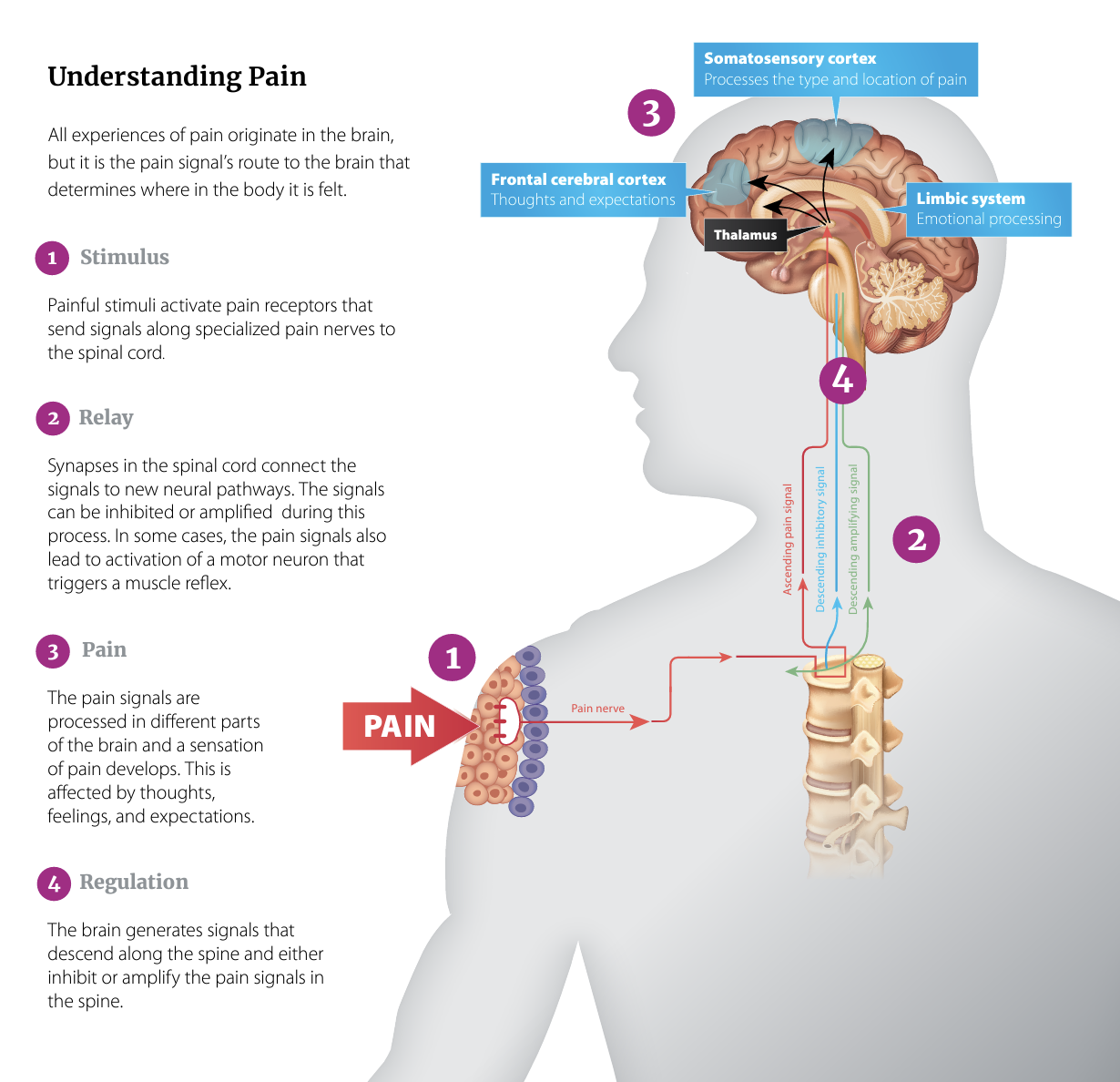 The mind influences pain levels, and pain can cause psychological distress. Psychologically, the experience of pain itself can rewire the brain over long periods of time to begin to perceive harmless stimuli as painful. Research has shown that those with a more hopeful outlook heal faster than those with less optimism. Decreasing stress and getting seven to nine hours of quality sleep are key components to allowing the body to heal and maintaining a hopeful outlook. Having a support network in friends and family and through other organizations can encourage you to cope with pain in a healthier way. It’s important to stay connected and remain hopeful during the healing process. In some circumstances, a mental health professional may provide additional help.