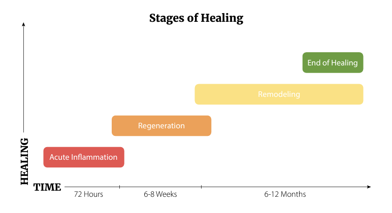 1. The acute inflammatory phase makes up the first 72 hours of an injury. During this phase, initial swelling and inflammation affects the injured tissues, and tissue repair is limited. Due to the increased inflammation, the first few days following an injury are often the most painful.