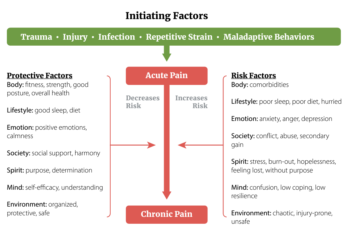 Chronic pain, unlike acute pain, is a false alarm. In general, pain that persists beyond three months is considered chronic; however, no tissue repair needs to take place. The cause of chronic pain starts with a change in how the nervous system interprets signals, and that transition may begin when inflammation fails to resolve, and all phases of tissue healing fails to be completed. While inflammation in an acute situation is beneficial and essential for proper healing, chronic inflammation can become destructive to joints and connective tissues, leading to more pain. Certain factors, including unhealthy dietary and lifestyle choices, perpetuate inflammation, prolong tissue healing, and fail to shut off the pain signal in the body. Over time the nervous system begins to misinterpret the signals. The nervous system becomes extremely sensitive, and reacts to stimuli that normally doesn’t trigger a pain response.