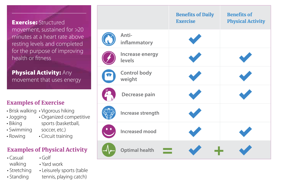 Research shows that both daily exercise and physical activity are essential for maximum health. For example, exercising one hour a day does not undo the negative effects of sitting for eight hours a day. Movement is a key way our bodies accomplish goals both visible and invisible.